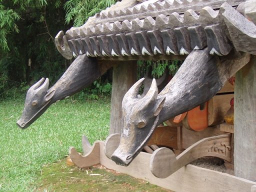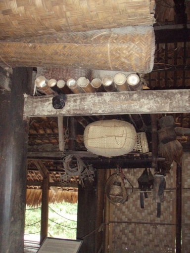 On pourrait rester des heures à comparer les différents usages. On retrouve souvent : les autels des ancêtres, la chambre de la belle-fille ou chambre des jeunes mariés, les tabous concernant cette chambre, la cuisine : un petit foyer et un trépied même quand le plancher est en bambou. Permanence du bambou dans le mobilier, les rangements, les instruments de musique et même la charpente et les planchers. Les grosses tiges ont été aplaties pour faire les planchers ; sur de poutres de bois, perpendiculairement, des demi tubes de bambou et encore par-dessus les tiges éclatées. Ce plancher à clair voie très souple parait très fragile. J’hésite d’abord à marcher dessus. Les échelles ressemblent à celles des Tata Somba en Afrique : des poteaux avec des encoches. Certaines ethnies ont construit un habitat collectif sur pilotis : longue maison de Edês ou maison communautaire Banhar de 19 m de haut.
