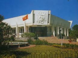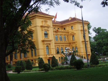 Plus loin, la Présidence est logée dans un grand château colonial repeint en jaune. Un peu trop repeint avec ses volets verts bicolores, des stucs et des guirlandes Belle Epoque. Sous le ciel bas et à l’ombre des grands manguiers on chercherait la bicyclette posée contre le grillage du tennis et on entendrait la mendiante d’India Song crier…de l’autre côté du petit étang entouré par une balustrade jaune se trouve un groupe de maisons jaunes et vert plus simples, les communs du château. C’est là que de 1954 à 1958 HôChiMinh vivait dans la plus grande simplicité.