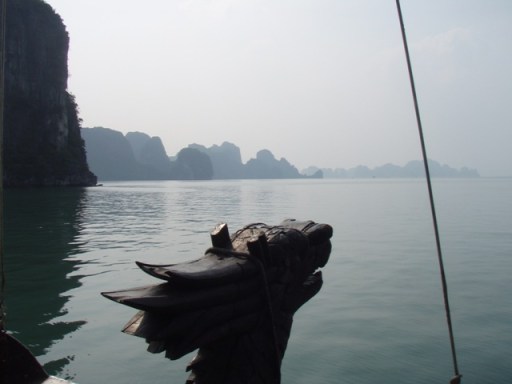 Des aigles pêcheurs planent et plongent tandis que les îlots se rapprochent. Il fait bon sur le pont dans la fraîcheur du matin. Dong nous montre les silhouettes des rochers qu’on a coutume de distinguer : le chien qui se détache, montant la garde, la tortue dont on voit bien la tête, le bol d’encens – plus difficilement reconnaissable, deux rochers se font face : les deux coqs de combat – symbole de la Baie. Nous rencontrons d’autre bateaux de touristes, certains beaucoup plus gros.