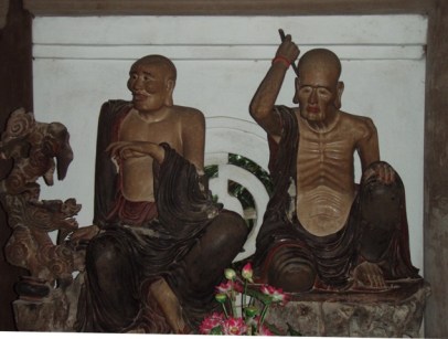 Cette pagode est située dans un endroit charmant avec un petit lac orné de ses deux ponts couverts. En son centre : un petit pavillon. Quelle jolie scène pour les marionnettes aquatiques ! Pas étonnant que le Maître vénéré ici soit un Maître de Marionnettes ! Sur le pont couvert, le jeune homme qui s’était proposé tente de nous vendre deux feuilles d’or en forme de lotus, offrande porte-bonheur. On refuse, le jeune homme nous suit sur son vélo jusqu’au porche qui mène à un escalier qui grimpe dans la colline.