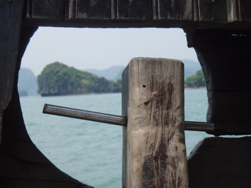 Nous sommes émerveillées: notre jonque est un beau bateau de bois vernis avec la tête de proue sculptée, deux mats, voiles jaunes repliées. Au dessus de la cabine, sur le pont deux chaises longues en bambou L’ équipage se compose du capitaine, tout de blanc vêtu plutôt costaud, du cuisinier, très mince et d’une jeune fille en pantalon noir et chemisier blanc.