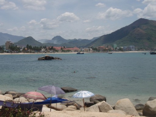 Sur le sable blanc assez grossier, des chaises longues en bambou et des parasols sont alignés en rangs serrés. Les plagistes se disputent l’honneur de nous placer. Il est 12H15 tous les vietnamiens font la sieste et ont déserté la plage. On nous apporte le menu en vietnamien et sans les prix. Pour 80 000VND, nous aurons un beau plat de riz frit aux produits de la mer : vrai poisson en morceaux, vrai crabe, minuscules rondelles de chorizo, crevettes, œufs, carottes, petits pois. Un délice !