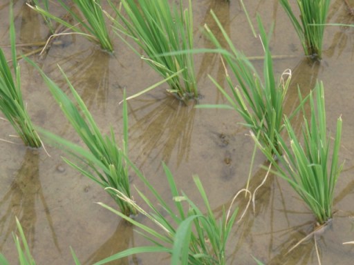 La plupart des rizières sont labourées, hersées à l’aide de la traction des bœufs ou des buffles, les motoculteurs commencent aussi à être utilisés. Les tâches que nous observons sont variées. Ici, on repique. Là on irrigue. Plus loin, on pulvérise des insecticides ou on épand des granulés d’engrais. Les paysans sont pieds nus toute la journée dans l’eau. Ici, on fait deux récoltes de riz par an plus une autre culture (soja, maïs, légumes). Beaucoup de femmes travaillent aux champs. On ne voit pas d’enfants et cela me réjouit bien. Les femmes sont complètement masquées. Une large bande de tissu maintient le chapeau traditionnel. Parfois elles rajoutent un autre masque. Le repiquage me paraît être le travail le plus pénible, le dos cassé.
