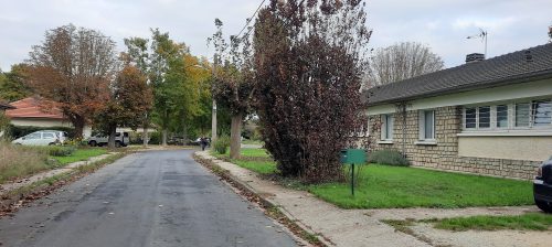 C’est la Cité de l’Air en bordure des pistes de l’aérodrome, construite en 1946 pour le personnel de l’aéroport et le personnel navigant. Verdure et calme, malgré la proximité des pistes on n’entend pas un avion, les couloirs aériens ne passent pas par là. Etrangement, ce quartier n’est pas privilégié, au contraire des pavillons sont murés, ils ont été squattés, on y a installé des réfugiés et une rénovation est prévue avec la construction d’un écoquartier.
