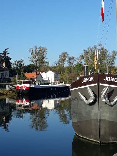 la brume s’est levée et j’ai rejoint Moret/Loing par le chemin de halage qui traverse des chantiers navals où de grandes péniches sont retapées.