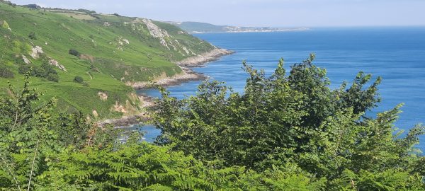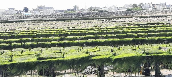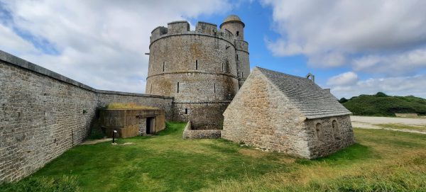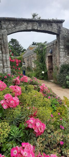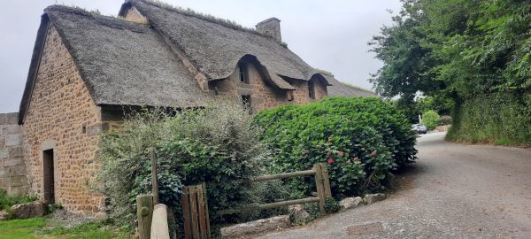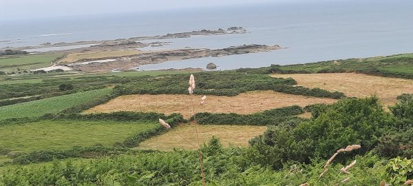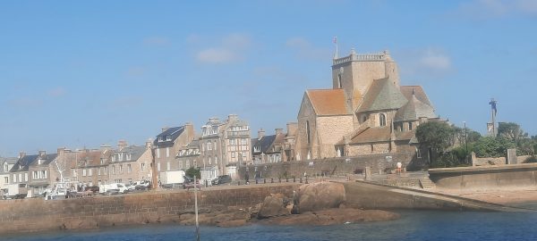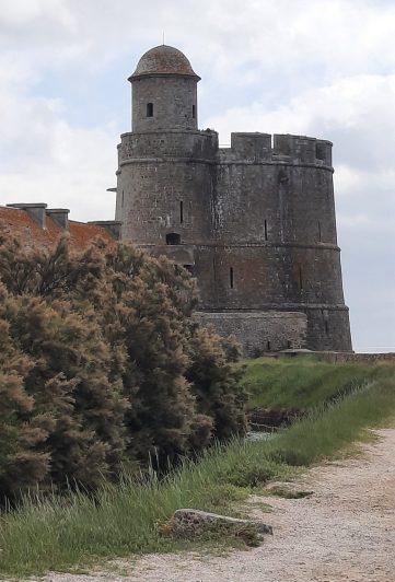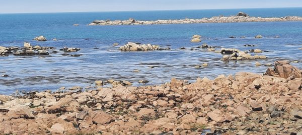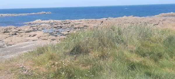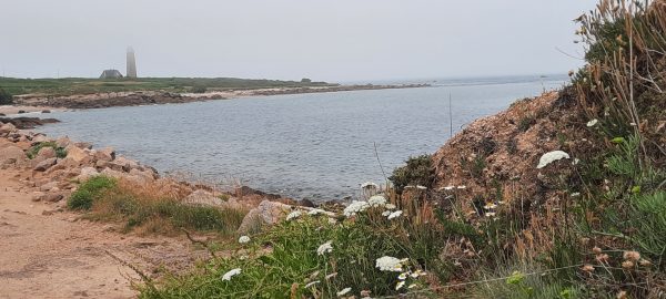 Le brouillard s’est levé et nous déjeunons en regardant la mer se retirer et les rochers granitique sortir de l’eau. Je reprends mes déambulations sur le GR 223 au plus près de l’eau, je passe le vieux fort aménagé en hôtel, le petit port et continue jusqu’à ce que le sentier quitte le rivage.