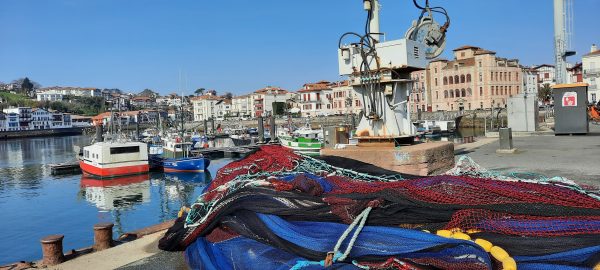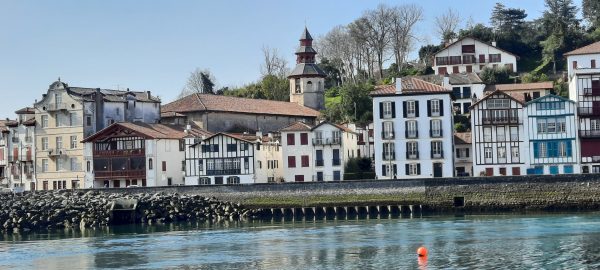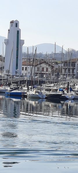 Sur le port, les filets entassés ont de belles couleurs, du pourpre au violet et bleu vif peu communs. Les bateaux de pêche sont verts blancs rouge – couleurs basques. Ciboure – en face – est photogénique à l’arrière des mâts. Deux tours m’intriguent, blanches l’une est soulignée de vert, l’autre de rouge ; ces Feux de Saint Jean de Luz (1937) sont l’œuvre d’un architecte : André Pavlovsky qui a construit d’autres bâtiments dans la ville.