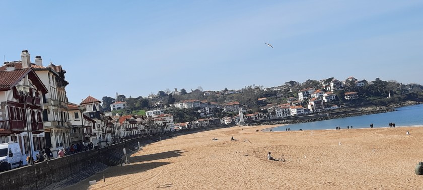 Nous reprenons la voiture pour aller à Ciboure. Passons sans nous arrêter devant la maison où est né Ravel. Puis continuons jusqu’à la plage de Socoa. Le fort de Socoa fut construit au 17ème siècle pour protéger la baie de Saint Jean de Luz et le petit port de Socoa. Une longue digue s’avance en mer terminée par un édifice peint en blanc et vert. Une autre digue est une île artificielle. Au bord du petit port les terrasses des restaurants sont désertes mais paraissent bien sympathiques.