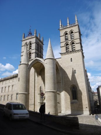 A l’origine, la cathédrale était la chapelle du couvent des bénédictins qui lui est accolée. C’est là que se trouve la Faculté de Médecine. On croirait qu’il n’y a qu’un seul bâtiment, cette grande homogénéité de construction m’a frappée. En 1181, le seigneur Guilhem VIII, stipula que quiconque, quelle que soit sa religion pouvait y enseigner. En 1220 fit crée la première école de médecine. Des plaques de marbre à l’intérieur attestent le nombre de médecins juifs qui y professèrent au 13ème et plus tard. Le vestibule est orné de nombreux bustes en bronze. Le patio est en face du « théâtre anatomique » où l’on procédait à des dissections. Nous ouvrons la porte de la bibliothèque sans s’attarder pour ne pas déranger les étudiants qui y travaillent, découvrons furtivement les belles boiseries et les livres anciens rangés jusqu’aux hauts plafonds.