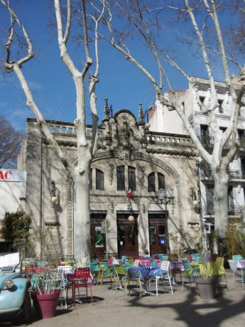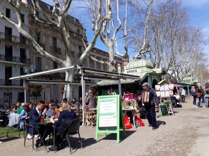 L’Esplanade Charles de Gaulle est occupée par un grand jardin arboré bordé par le Musée Fabre, le pavillon Populaire, l’ancien cinéma Pathé et se termine par le Corum. Le long de ses allées il y a des guinguettes et restaurants de plein air où nous déjeunons. Nous choisissons le Kiosque à Malices qui propose des plats du jour et café pour 12€ assis à table ou de la restauration rapide, burgers et frites où des lycéens et étudiants font la queue debout. Nous choisissons des saucisses de l’Aveyron grillées accompagnées de haricots verts.