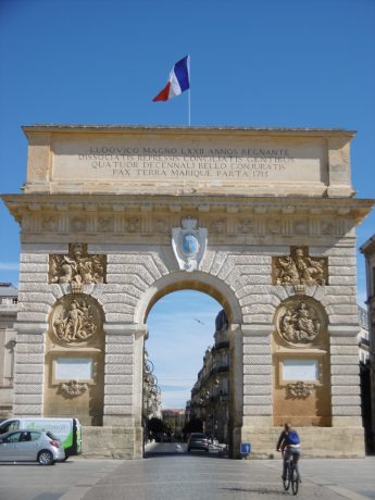 Parc du Peyrou : l’arc de triomphe se photographie plus facilement à pied qu’en petit train ! la statue équestre de Louis XIV dominait la ville de sa hauteur, aucun immeuble ne devait être plus haut. Elle fut fondue à la Révolution pour faire des canons. En 1828, une nouvelle statue remplaça la première. J’ai préféré celle de Lyon, plus impressionnante. A l’extrémité du parc, le Château d’eau est une construction très élégante, aérien, sur des arches hautes et gracieuses ornées de filets et de poissons. L’eau est convoyée par l’aqueduc Saint Clément, (1766) inspiré du Pont du Gard, 14 km sur deux étages. Il a donné le nom de Quartier des Arceaux au quartier plus bas
