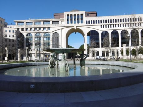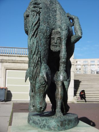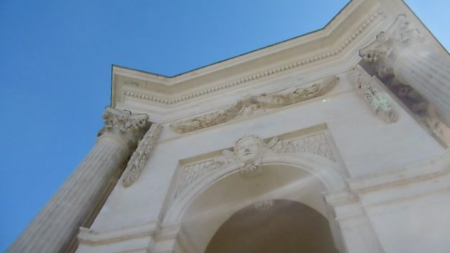 Le tramway n°1 passe devant la gare Saint Roch, nous en descendons place de la Comédie qui doit son nom à l’Opéra-comédie construit initialement en 1755 mais détruit plusieurs fois, reconstruit en 1888 par un élève de Charles Garnier. Des immeubles Belle Epoque aux sculptures un peu délirantes, entourent la place ovale, en forme d’œuf d’où son nom familier de Place de l’œuf. Le contour de l’ovale est matérialisé par un liseré orange se détachant sur le marbre beige. Une fontaine, sorte de rocaille, porte Trois Grâces : Aglaé, Euphrosine et Thalie, filles de Zeus. Montpellier n’a pas attendu Bofill pour faire appel à la mythologie grecque. Œuvre d’Etienne d’Antoine (1773) elle ornait autrefois la Place de Canourgue en 1793 (en même temps que la statue de Louis XIV). L’original en marbre de Carrare a été remplacé par une copie.