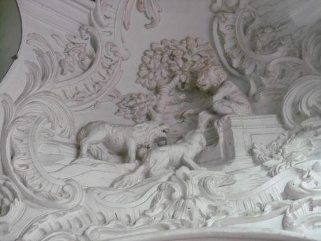 29 rue de l’Aiguillerie, adjacente à l’Hôtel Guilleminet, nous entrons dans une boutique, admirer des gypseries (stucs) illustrant les Fables de La Fontaine (1757). Je reconnais le Corbeau et le renard, la Cigogne et le Renard.
