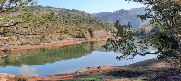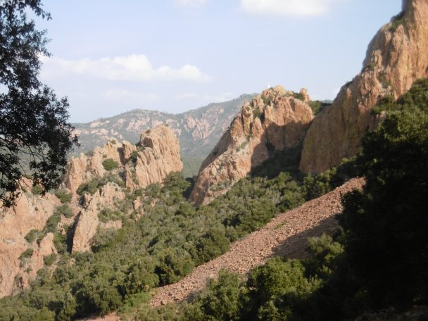 En marchant, je remarque des cavités dans les roches, des inclusions qui m’évoquent du volcanisme. Les roches rouges, porphyre rouge, rhyolites sont les mêmes qu’en Corse. Sur le site Estérel-Côte d’Azur Je trouve l’explication de la formation du Massif de l’Estérel il y a 290 MA (Stéphanien) puis Permien avec ouverture de failles et coulées d’ignimbrites. A l’ère Tertiaire, un épisode magmatique a permis la remontée d’esterellite (roche magmatique bleue très dure qui a cristallisé dans des sills entre Boulouris et Agay.). Si j’avais lu cet article avant la randonnée, j’aurais peut-être cherché les prismes de trachytes en face du Port de Santa Lucia.