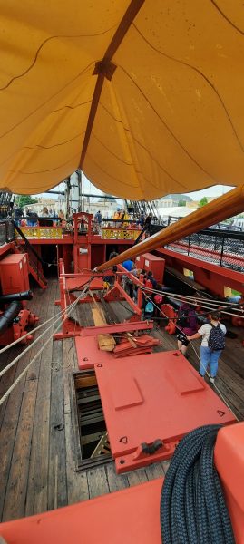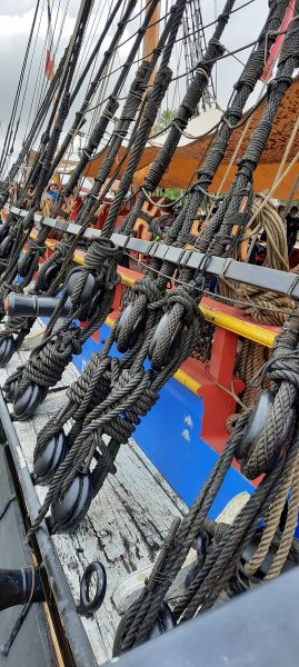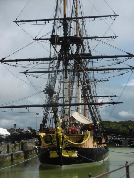 Quand nous sommes venues la première fois, L’Hermione était encore en chantier et n’avait pas pris la mer, cette année elle est revenue de ses lointains périples. On se presse pour la visiter. L’Hermione historique est née en 1778 dans la cale de Rochefort et a pris part à la Guerre d’Indépendance américaine du côté des Insurgents. La reconstitution se veut la réplique fidèle, à taille réelle, capable de naviguer. Si la construction initiale a duré 6 mois, la reconstitution en pris 12 ans parce qu’il a fallu retrouver les techniques oubliées et les outils correspondants.