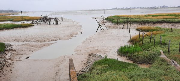 Les barques maraîchines, les batais, ont une curieuse particularité : la pointe est à l’arrière tandis que la proue est plate. Le guide explique que le transport des vaches a imposé cette forme. Les vaches montent par l’avant. Selon lui, on a inventé une meilleure manière de les changer de pâture : des ponts aux montants de béton, poutres métalliques et traverses de chemin de fer.