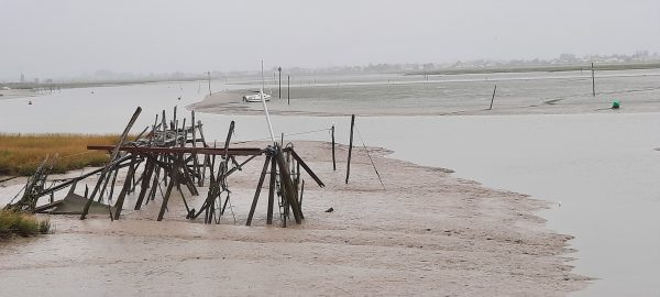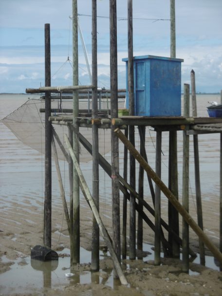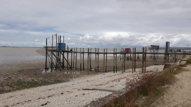 Nous déjeunons près de la Pointe Saint Clément, en bord de mer. De nombreux carrelets s’avancent dans la mer au-dessus de la vase de la Baie de l’Aiguillon. De l’autre côté de la route, des établissements conchycoles avec leurs bassins vendent moules et huitres au détail, proposent des dégustations en terrasse (fermé le lundi ici aussi). Il fait beau, nous avons du carpaccio de saumon à l’aneth au zeste de citron et du bon pain frais et ce n’est pas mal non plus.