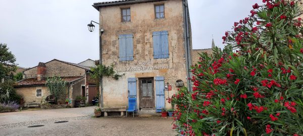 Arçais est une petite commune de 612 habitants très tranquille, fleurie avec d’innombrables roses trémières, des maisons aux murs de pierres sèches, aux petits moellons aplatis, blanc avec des volets souvent bleus. Sur la place de l’église, quelques boutiques pour touristes vendent des souvenirs de bon aloi, torchons mais surtout des produits locaux : angélique et mogettes. Une petite galerie d’art. Rien de tapageur.