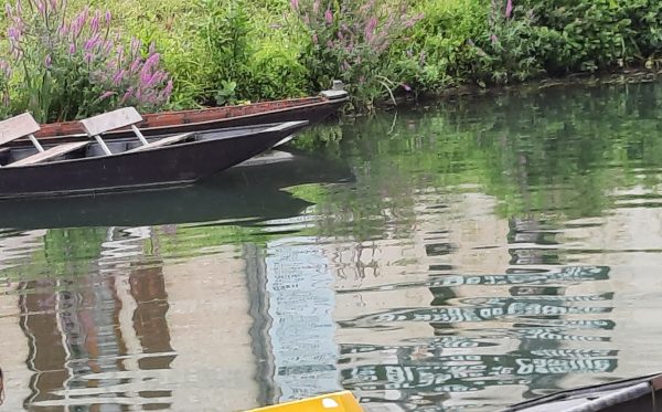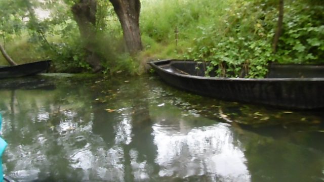 A l’embarcadère, deux comptoirs. L’un pour les canoës, l’autre pour les barques. Je m’inscris pour une promenade guidée : 1h30 (21€ en dessous de 4 personnes, 12€ si on est plus nombreux). On me conseille une courter promenade de 45 minutes sur le chemin de halage. Après avoir passé les trois passerelles arquées, prendre à droite pour revenir à travers le village (balisage jaune). Le long du canal, une rigole, je remarque les petits débarcadères privés : quelques marches, une barque amarrée souvent. Sur la rive d’en face, une belle maison aux volets bleus. C’est la seule maison complètement isolée qu’on ne peut atteindre qu’en barque. En face, les maisons ont un autre accès par la route. Dans un très beau jardin poussent des haricots, des tomates, des carottes ; c’est un jardin collectif. Plusieurs habitants se sont regroupés pour le cultiver. Le retour par le village est aussi pittoresque mais la pluie commence à tomber dru.