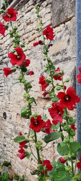 Sous une belle averse, le GPS nous conduit par Nieul-sur-mer et Marsilly, jusqu’à Esnandes. Attention aux appellations trompeuses Nieul-sur-mer est à 2.5 km de la côte. Ces villages ont l’air bien vivants avec des constructions neuves mêlées aux maisons charentaises traditionnelles (maisons basses aux toits de tuiles romaines) et belles maisons bourgeoises à l’arrière de jardins clos de murs avec de belles grilles. Petits centres commerciaux. Il est plaisant de constater qu’il existe des villages et pas uniquement des lotissements des promoteurs et que les horribles abords des villes avec leurs zones artisanales ou zones commerciales n’ont pas phagocyté tout l’espace. Les roses trémières sont merveilleuses. J’associe toujours ces fleurs aux Charentes et à l’île de Ré.