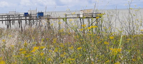 Après le déjeuner, les nuages ont disparu. Le soleil d’Août est bien chaud et la balade sur les bords de la Baie de l’Aiguillon est bien agréable (sauf les galets sous mes sandales). Galets que j’aurais pu éviter en marchant plus bas sur la piste cyclable bien lisse, mais la digue m’aurait caché la mer. J’ai préféré marcher au plus près de l’eau entre les beaux fenouils en fleur dont j’égraine les ombelles qui exhalent un parfum agréable que je garde sur mes doigts. Des panneaux instructifs racontent l’histoire et l’écologie de la Baie de l’Aiguillon. On pourrait observer des Tadornes de Belon et des avocettes mais je vois surtout des goélands sur la grève aujourd’hui. Les petits ports sont signalés avec des noms pittoresques comme le Port de la Pelle et le Coup de Vague. Difficile d’imaginer qu’ils rivalisaient autrefois avec le port de la Rochelle ! Cette belle promenade se termine sur les falaises du Pertuis Breton. J’aurais aimé poursuivre jusqu’à la Pointe du Plomb où nous étions ce matin.