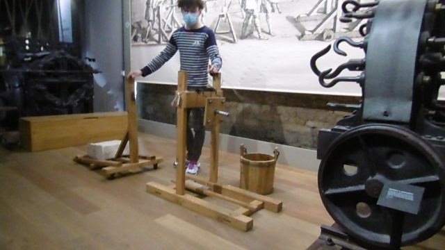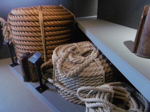 Partant du chanvre, vu sur écran seulement ; j’aurais aimé voir la plante ! Le chanvre est broyé dans une lourde machine qui ressemble un peu à un massicot qui n’aurait pas été tranchant. Les fibres obtenues sont nettoyées avec une espade ressemblant à une batte de base-ball puis peignée avec des peignes de bois portant de longues pointes ; Le fil sera ensuite filé. Les objets sont disposés dans des vitrines avec de nombreuses explications mais la démonstration de cordage sera plus parlante. Un jeune homme a posé deux chevalets devant une fresque d’époque. Sur chaque chevalet, 4 crochets permettent de fabriquer 4 torions (avec l’aide d’une petite fille qui va faire tourner le mécanisme avec beaucoup d’enthousiasme). Le Commettage va enrouler ensemble les différents brins pour former une aussière. Les grelins rassemblent plusieurs aussières. Les grelins permettent de remonter l’ancre.