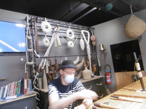 Une autre démonstration est celle du matelotage, savoir-faire de marine ou l’art de faire des nœuds (mais pas que). L’outil à tout faire est l’épissoir. Il faut aussi un couteau. De nombreux objets sont présentés, suspension de lampes, bouteilles….
