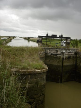 Un peu avant Charron nous remontons vers le nord et trouvons les belles écluses sur le fleuve et les canaux qui convergent. Est-ce donc là les Portes à la Mer qui contiennent l’eau douce de la rivière et empêchent l’eau salée d’y pénétrer. Sur la plupart des rivières les écluses permettent la navigation. Dans le Marais, leur rôle est plus complexe. Elles permettent de réguler tout le réseau hydrographique. De nombreux pêcheurs sont installés sur les berges à proximité. Nous croisons de nombreux cyclistes bien courageux de pédaler sous la pluie.