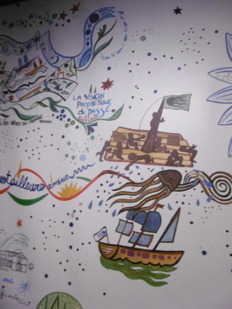 Un mur est occupé par une fresque racontant l’histoire de la corderie, commençant avec un soleil, figurant Louis XIV, puis la Colonisation, la Traite Atlantique, le Radeau de la Méduse, qui raconte aussi les naufrages des migrants actuels qui prennent la mer sur des embarcations incertains, la construction de l’Hermione, bateau rouge comme le sang pour que les marins ne voient pas le sang des blessures le tout relié par des vagues colorées. Des citations de Victor Hugo, Baudelaire, Glissant, Césaire.