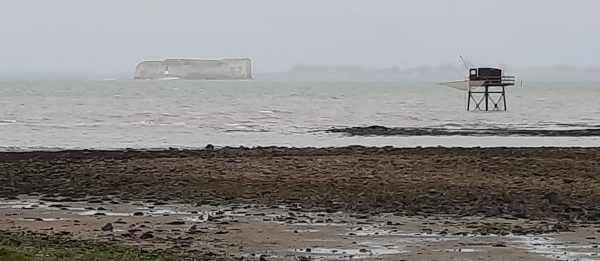 Comme nous sommes en avance nous en profitant pour regarder Ford Boyard et FortEnet construits sur des îlots proches de la côte mais noyés de brume. Oléron barre l’horizon au Sud-Ouest tandis qu’on devine vers le Nord le pont de l’Île de Ré, l’Île d’Aix est si proche qu’on voit les plages et les arbres. Je n’imaginais pas les îles Atlantiques si proches.