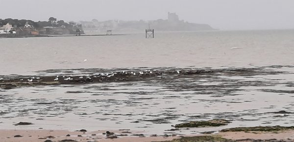 Toujours faute de parking (je n’ai pas envie de me promener mouillée dans l’air très frais) je choisi la plage Sud, très tranquille. Drapeau vert, deux nageurs et un gamin sur une planche de paddle sous les yeux d’un sauveteur. Pour tester la température de l’eau, je marche d’abord les pieds dans l’eau, jusqu’aux chevilles puis mi-mollets. Elle n’est pas froide. J’y vais. Ce que je ne savais pas c’est que les fonds sont vaseux et que l’eau est peu profonde. Je glisse et m’enfonce (réminiscence du mont Saint Michel). Quand je ange mes genoux traînent dans la vase. Comme d’habitude je nage jusqu’à la bouée jaune qui marque la limite de la baignade et va de bouée en bouée. Une averse s’abat timidement. Ce n’est pas gênant quand on est déjà dans l’eau. Cette baignade ne sera pas une baignade mémorable. Mais j’aurais regretté de n’avoir pas tenté !