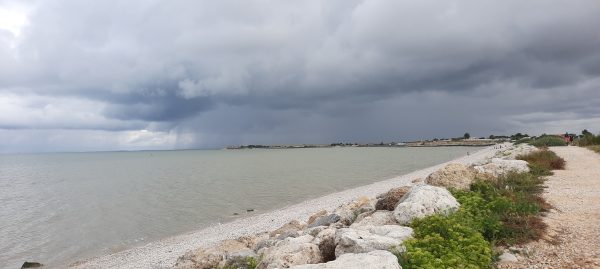Départ 5h45, autoroute fluide, temps sec. Arrivée 11h aux alentours de La Rochelle où nous rencontrons les premiers embouteillages que nous évitons en bifurquant vers l’aéroport et L’Houmeau. A l’arrière de la plage, se trouve une Réserve Naturelle (zone humide). Le pont de l’île de Ré se profile, lumineux sur un ciel menaçant des nuages très noirs.