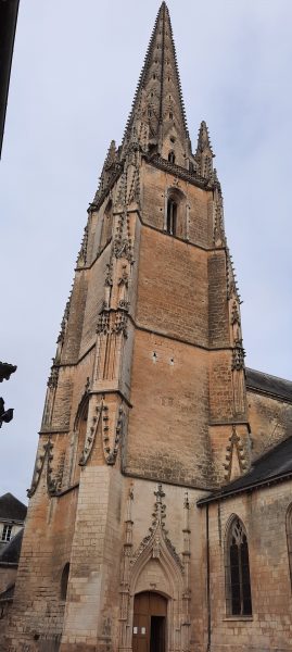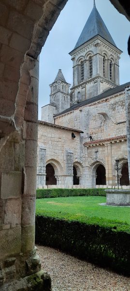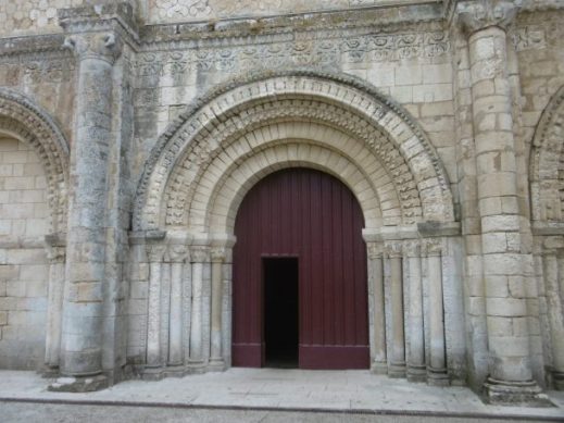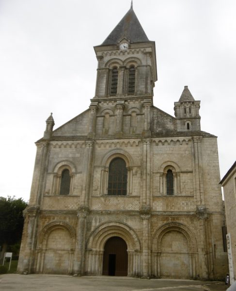 La mère d’Aliénor d’Aquitaine, Aénor de Chatellerault, fut enterrée dans l’Abbatiale, on dit qu’Aliénor y naquit ; elle en fit une Abbaye Royale. J’ai la chance d’arriver au moment où la visite guidée commence. La guide nous conduit sur le parvis et explique les principes de l’art roman : trois parties (verticalement et latéralement) rappel de la Trinité. De part et d’autre du portail deux portails aveugles. Au 16èe siècle le clocher fut détruit le clocher actuel est XIX ème. Une frise en entrelac porterait des motifs rapportés de Norvège.