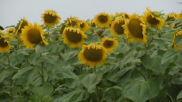 Sous le ciel gris, le Marais Desséché n’est pas pittoresque avec ses grandes cultures. Heureusement les tournesols donnent un peu de couleur, gorgés d’eau, ils penchent la tête et p,t une allure pitoyable.