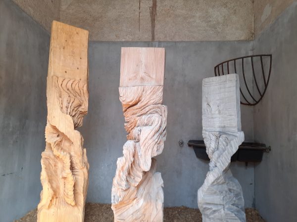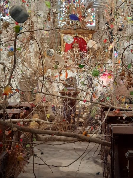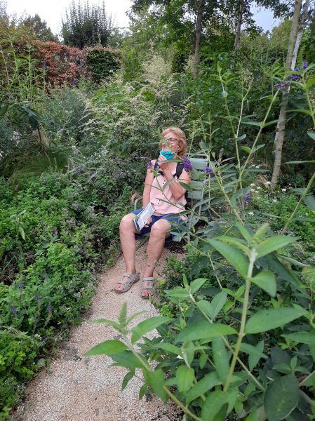 Nous entrons dans le Festival des Jardins qu’il se met à pleuvoir. Ce n’est pas grave : nous sommes équipées de capes. Tandis que les touristes se précipitent sous les arbres au mépris de toute distanciation sociale, nous passons dans les allées snobant les gouttes. Le parc est immense, difficile de trouver la sortie. « Allez aux Prés du Goualoup« , nous conseille-t-on. Les distance sont grandes. Il y a bien une sortie sur un parking mais éloignée d’un bon km de nos vélos, on rentre à nouveau dans le parc, au bout de 20 minutes on trouve la bonne issue.