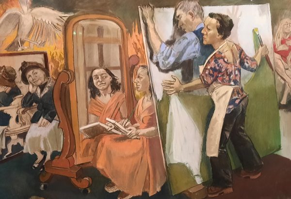 Antigone de Bauchau commence avec le retour de l’héroïne à Thèbes après la mort d’Œdipe. Antigone est entourée des compagnons de son père : Clios qui peint une fresque pour Thésée à Athènes et qui la met en garde: