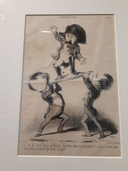 Daumier dessine Hugo et Girardin portant Napoléon Bonaparte sur un pavois avec la remarque « Ce n’est pas solide »