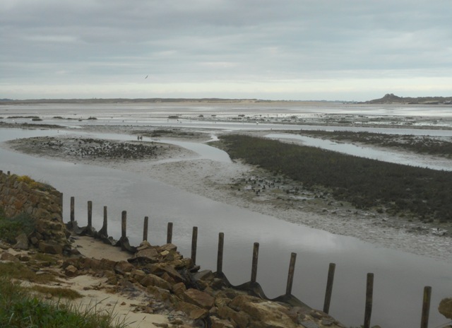 Le sentier court un peu plus haut que le sable au niveau des champs. Dans l’échancrure de l’Horn je distingue des silhouettes poussant des perches – des pêcheurs de crevettes, j’imagine d’abord ; Non ce sont des surfeurs avec une rame ou du paddle. Le sentier contourne la très mince pointe de Tout en Ouch où un paléosol a livré des objets de l’âge de fer.