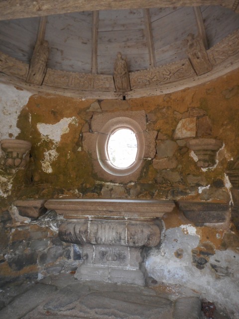 L’enclos contient le cimetière actuel avec des tombes très fleuries à une semaine de la Toussaint. Un ossuaire se trouve sur un côté. De l’autre un curieux abri avec un toit très pentu en lauzes, un élégant œil de bœuf et à l’intérieur des boiseries sculptées de motifs naïfs et grotesques. L’église a été ravagée par trois incendies (le dernier en 1955), son clocher carré est sans grâce et l’intérieur assez classique. De beaux vitraux contemporains aux motifs de plomb très légers éclairent l’intérieur. Une dame est très choquée que nous nous dépêchions de sortir avant que ne commence l’office. Au fond une bâtisse imposante avec une tourelle était peut être l’ancien presbytère.