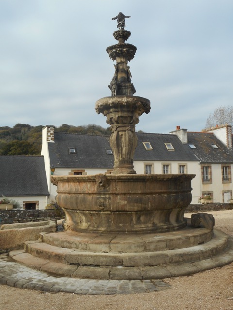 Autre curiosité : les Maisons de Garde des Amiets et de Lavillo, édifiées en 1744 pour émettre des signaux en cas de navires ennemis, ils n’abritaient que 3 ou 4 guetteurs. Il reste une très belle cheminée. Ces maisonnettes sont très bien situées sur des pointes et s’intègrent dans le décor de chaos rocheux. Après Poulfoën je passe devant des « rochers atypiques » isolés. J’ai cherché sans la trouver la fontaine de Saint Eden. Une belle maison est construite non loin et sur la côte et le entier côtier est dérivé vers l’intérieur sur une route goudronnée dans les maisons du petit village de Menfig construit de très belles maisons de pierre. L’une d’elle a un beau puits dans son jardin.