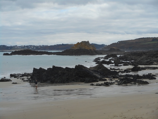 Le long cordon dunaire de Keremma ferme presque la baie. Le GR traverse le parking du camping Ode Vaz . De là, une route conduit à la dune. Des panneaux conseillent de ne pas quitter le chemin balisé « la dune est fragile, reconstitution d’une dune grise ». Disciplinée je marche sur le parcours balisé sur une herbe très fine rase ou sur une mousse épaisse. C’est doux, très vert. Mais on ne voit pas la mer ! Est-ce marée haute ou basse mer ? Je n’en ai aucune idée. Si au moins l’itinéraire suivait la crête ! Mais « la dune est fragile ! ». Au bout de deux km environ, je me lasse et grimpe la dune pour descendre sur la plage. Je quitte chaussures et chaussettes trempées et marche avec grand plaisir sur le sable fin souple et bien tassé jusqu’à une pointe rocheuse, avec deux rochers ressemblant à deux doigts faisant le V de la victoire. Plus loin dans les rochers des pêcheurs à pied grattouillent.