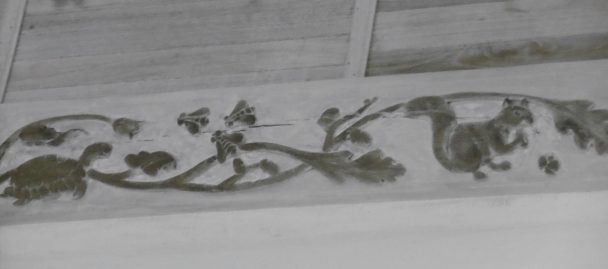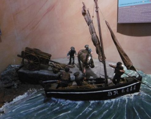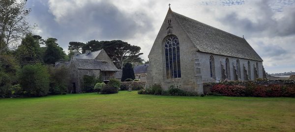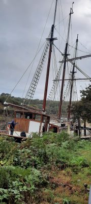 J’ai pris mon bâton de marche en prévision des chemins mouillés et glissants et je trouve le GR à deux pas de notre gite de Saint Antoine le long de l’Aber Wrac’h vers l’intérieur. Je me méfie, dimanche dernier, je me suis perdue à Kerviré, une ferme un peu à l’écart de la côte, j’avais fait au moins 3 km de plus pour retrouver le sentier (grâce au GPS de Visorando) . Au lieu de suivre le chemin agricole dans les maïs, je trouve le GR qui s’engouffre dans les taillis, petite trouée que je n’avais pas remarquée, le chemin creux est aussi bien gadouilleux, je me félicite d’avoir mon bâton. j’arrive rapidement au chantier naval où une belle épave est répliquée à neuf. Un jeune homme explique qu’ils ont prélevé les 3 mâts pour les mettre sur le nouveau bateau. C’est un gros chantier : 30 charpentiers y travaillent parfois.