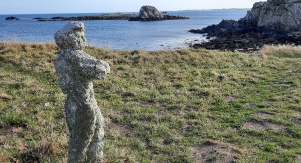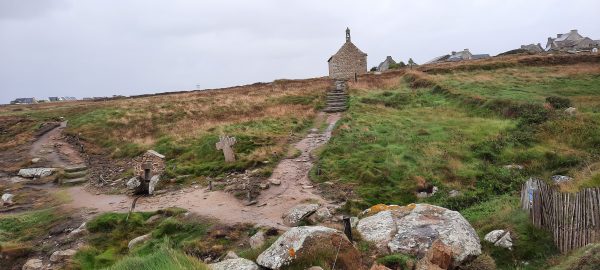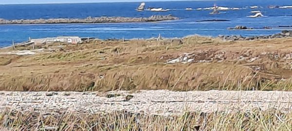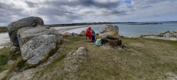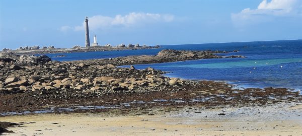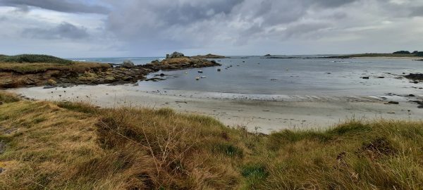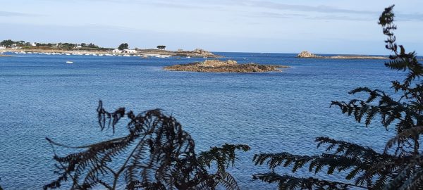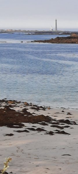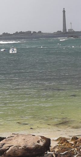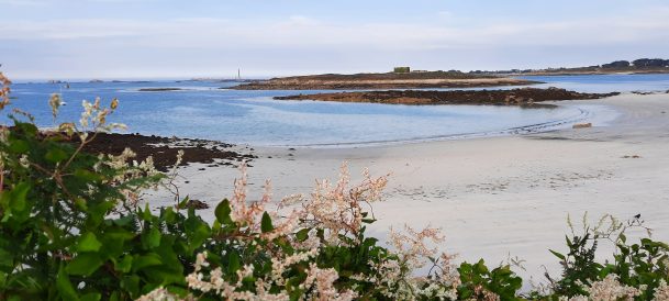 Après la plage de Saint Cava, le sentier colle bien à la côte, impossible de se tromper, une plage est bordée de restaurants, la pointe en face des phares de l’île Vierge – vue spectaculaire . A un tronçon plus sauvage vers Reun, succède une pointe un peu plus construite avec de jolies maisons bretonnes fleuries. Enfin, je retrouve Dominique à Porz Gwen près de viviers. Mais c e sont aux viviers de Paluden que nous achèterons les dernières moules des vacances!