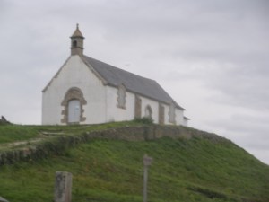 Un peu plus loin l’îlot Saint Cado relié à la côte par une digue. De belles maisons se reflètent, des barques colorées, et la petite flèche de la chapelle perchée dans la végétation. La lumière est parfaite, pas un nuage, l’eau lisse opaline…Promenade dans l’île tranquille, on découvre le calvaire perché sur un escalier devant une rangée de maisons blanches aux volets bleus. En face la chapelle toute simple de saint Cado. A l’intérieur le plafond de bois est peint en bleu tandis que les murs chaulés citent les paroles du saint. Des vitraux colorés modernes simples, quelques statues de bois peint… Derrière l’église on découvre une fontaine curieusement abritée par un petit pignon ondulant coiffé d’une croix celtique.