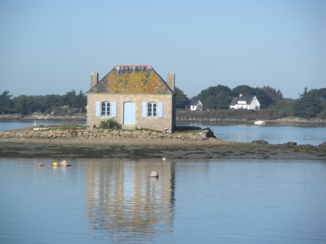 Le sentier côtier longe la ria se faufile entre des buissons bien taillés, des maisons au bord de l’eau. Des barques se balancent, une bizarre barge plate blanche au nom de Michigan. Sur la rive d’en face les maisons bretonnes au toit d’ardoise, crépies de blanc ou aux façades de granite sont tapies dans une anse. Les rives sont échancrées, simple creux ou ruisseau qui se jette dans la ria ? Les bruyères roses sont encore fraîches. Les prunelles bleues sont grosses comme des prunes. Les épines, couvertes de petites baies rouges.