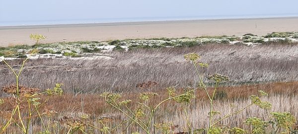 Pique-nique au soleil devant l’école de Char à voile de Charrueix. Nous suivons la côte en comptant les moulins à vent et en passant devant les établissements conchylicoles du Viviers-sur-mer.