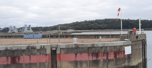 Côté Dinard, une partie du pont se soulève pour laisser passer les voiliers. Nous comptons les mats de la voiture. Les saumons et autres espèces qui remontent les rivières pourront passer comme les bateaux par l’écluse!