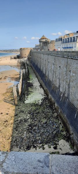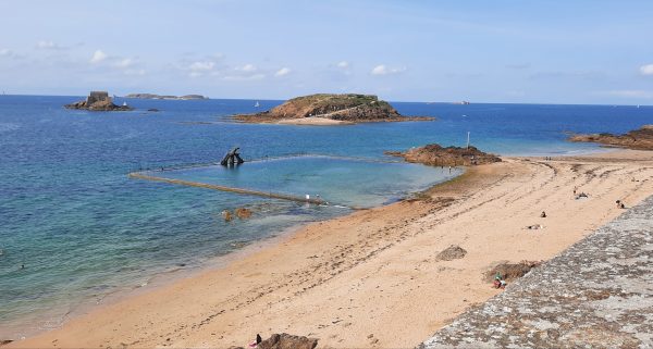 la ville close présente une remarquable homogénéité d’architecture même si certains bâtiments ont été restaurés au XXème siècle. Au niveau des remparts certains surprise rompent la symétrie. Promenade sous le soleil, à marée haute avec une mer turquoise et bleu profond. Les îles sont entourées d’eau. Il n’y aura pas de pèlerinage à la tombe de Chateaubriand . Je remarque une piscine naturelle d’eau de mer avec un haut plongeoir où je nagerais volontiers.
