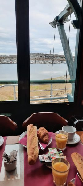 Petit déjeuner excellent servi au bar de l’Hôtel Aleth, occasion d’apprécier la décoration très réussi sur le thème de la marine : belle maquette de voilier, figure de proue, canapés de cuir, aquarelles et cartes marines.
