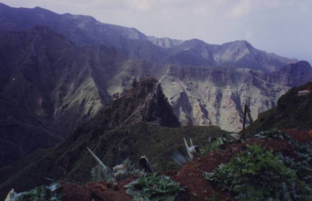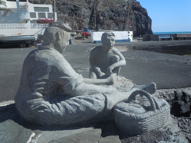 Los Gigantes est un site réputé de Tenerife. Nous descendons une route en lacet dans une campagne en terrasse. De nombreuses cultures poussent hors sol sous serre : bananes et surtout tomates. Cette Tenerife rurale, même enlaidie par des bâches en plastique, est bien sympathique. Nous traversons le village de Tamaimo, bien tranquille avant d’arriver à Los Gigantes : les falaises que nous avons vues au phare de Teno .Malheureusement, le site naturel est éclipsé par le gigantisme des résidences, hôtels, immeubles. Les promoteurs ont vu grand ! Tout un quartier adossé à la montagne est formé de studios identiques, terrasses en gradins, tous crépis de jaune. Un hôtel ressemble à un paquebot géant (belle architecture). Des quartiers entiers d’immeubles identiques sont en cours d’achèvement. Une jolie marina entourée de maisons canariennes à balcons de bois ajouré. Cette station est plutôt de meilleur goût que les constructions que nous avons vues auparavant. On a fait des efforts d’architecture. Il en demeure quand même que cette station balnéaire est le comble de l’absurde. En face des falaises qui tombent à pic dans l’océan, il n’y a aucune plage. Seules quelques piscines artificielles, un lagon de ciment. Ces immeubles abritent des milliers d’estivants qui n’ont rien ou presque pour se baigner ou même pour se promener. Le site est resserré, encaissé. La circulation automobile, un cauchemar. Qui est assez idiot pour acheter des milliers d’appartements au bout du monde sans même une plage ? Je monte sur la digue qui encercle la marina, même pas aménagée, pour prendre une photo. Dominique n’a pas eu le cœur de me suivre. De la voiture, elle me lance le porte-monnaie pour aller m’acheter une glace – une cassate délicieuse dans un restaurant du port.